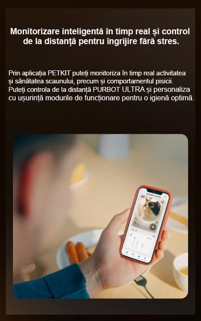 Într-o eră a automatizării și conectivității, PETKIT PUROBOT Ultra răspunde nevoilor stăpânilor moderni și ale pisicilor exigente. Cu funcția de curățare automată după fiecare utilizare, litierea este întotdeauna pregătită, fără eforturi din partea ta. Nu mai trebuie să verifici de fiecare dată dacă este curată sau să îți planifici timpul în jurul acestei sarcini neplăcute. PETKIT face totul pentru tine – în liniște, eficient și complet igienic.