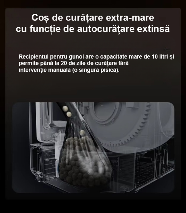 Sistemul de sigilare automată a deșeurilor menține totul curat și igienic, iar consumabilele ușor de înlocuit (precum filtrele sau deodorantele) transformă întreținerea într-o sarcină simplă și rapidă. PETKIT PUROBOT Ultra este, astfel, o investiție într-o locuință mai curată, un animal mai sănătos și un stil de viață fără compromisuri.